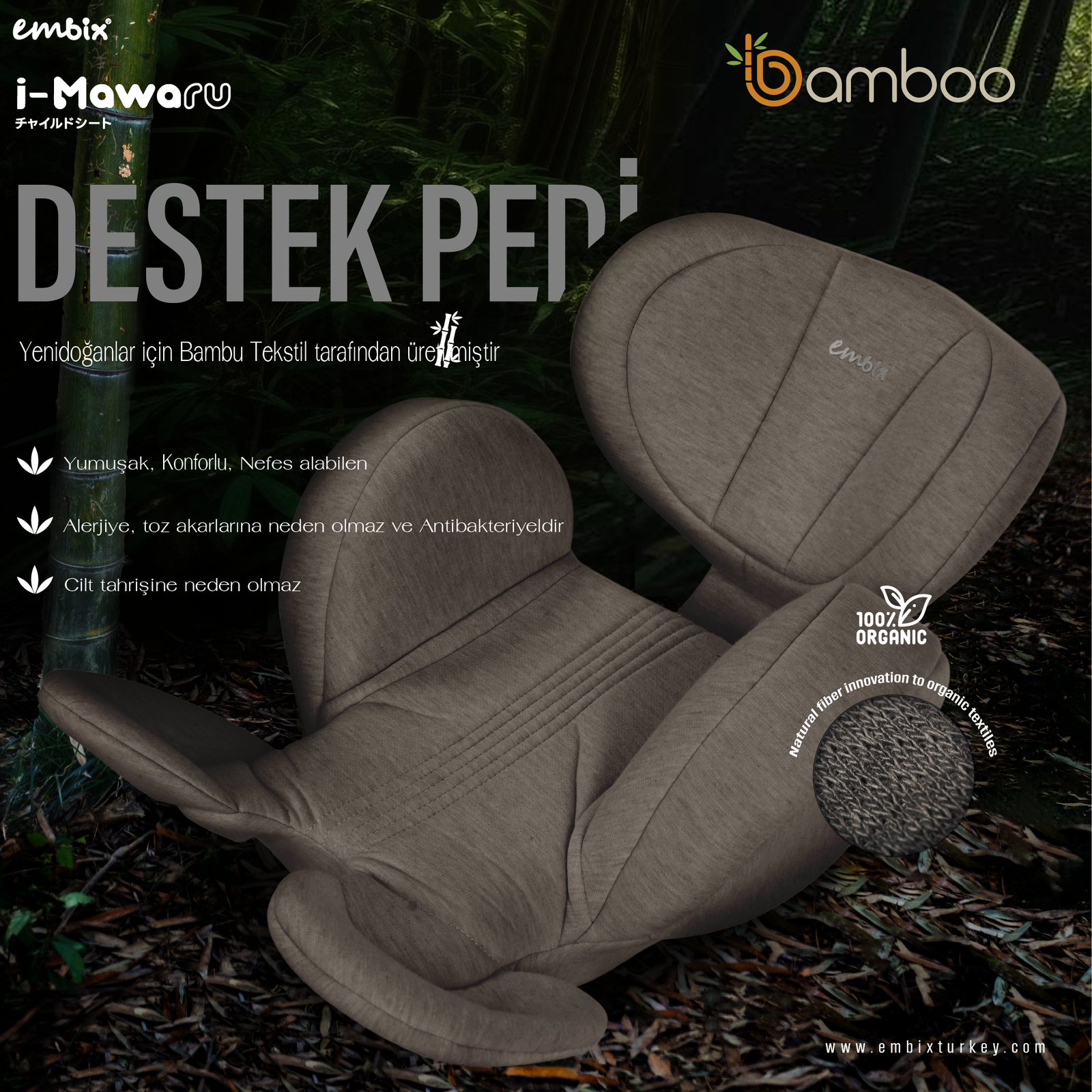 Doğal Bambu Elyaf Destek Pedi: Yeni doğanlar için, yumuşak ve hava geçirgen bambu kumaştan yapılmış destek pedi sunar. Bu kumaş hem nefes alabilir hem de hızlı kurur.