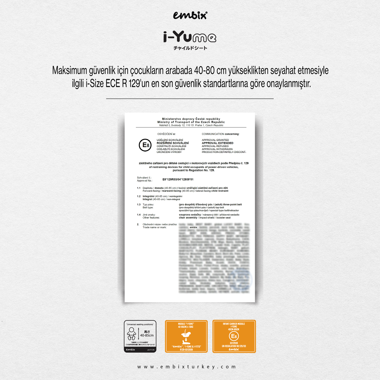 i‑Size ECE R129/03 Sertifikası: Avrupa güvenlik standartlarını karşılayan yüksek koruma seviyesi sunar.